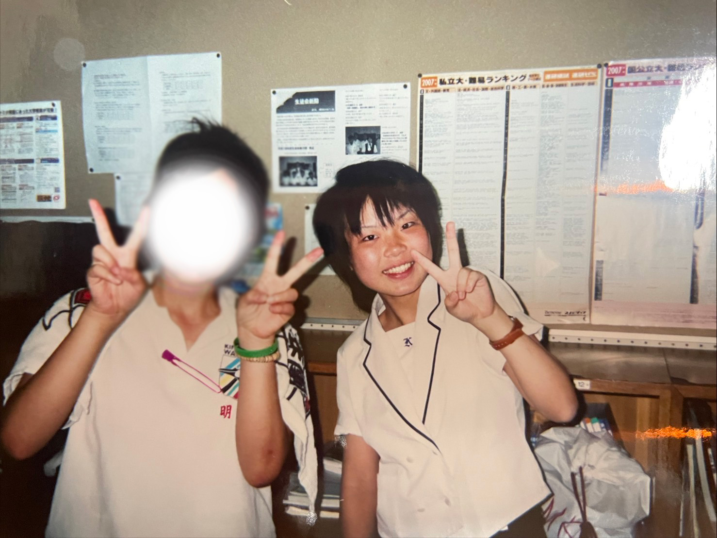 高校時代の藤井さん(右)。教室うしろの大学のランキングが進学校を感じさせる。