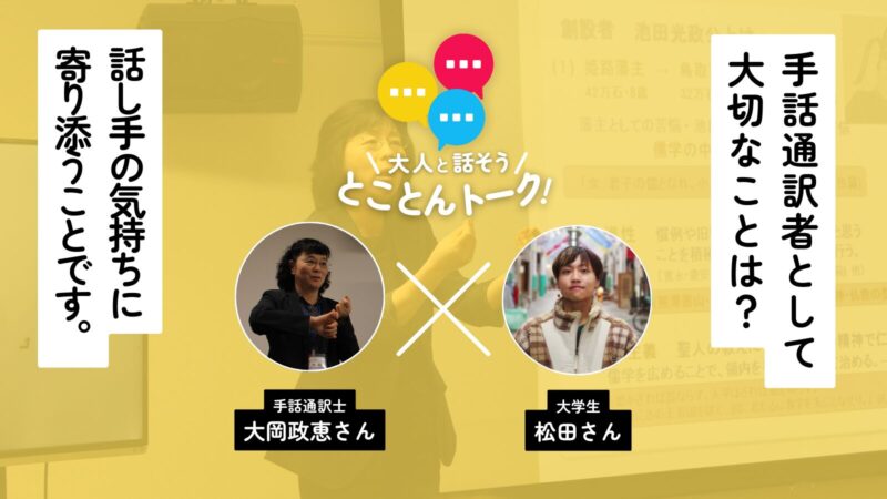 手話学習者から手話通訳者へ、そして手話通訳士へと研鑽(けんさん)を重ねながら手話通訳を仕事とする大岡さんは、どんなことを語ってくれたのでしょうか。手話の世界が少しだけ近くなる、とことんトークです。